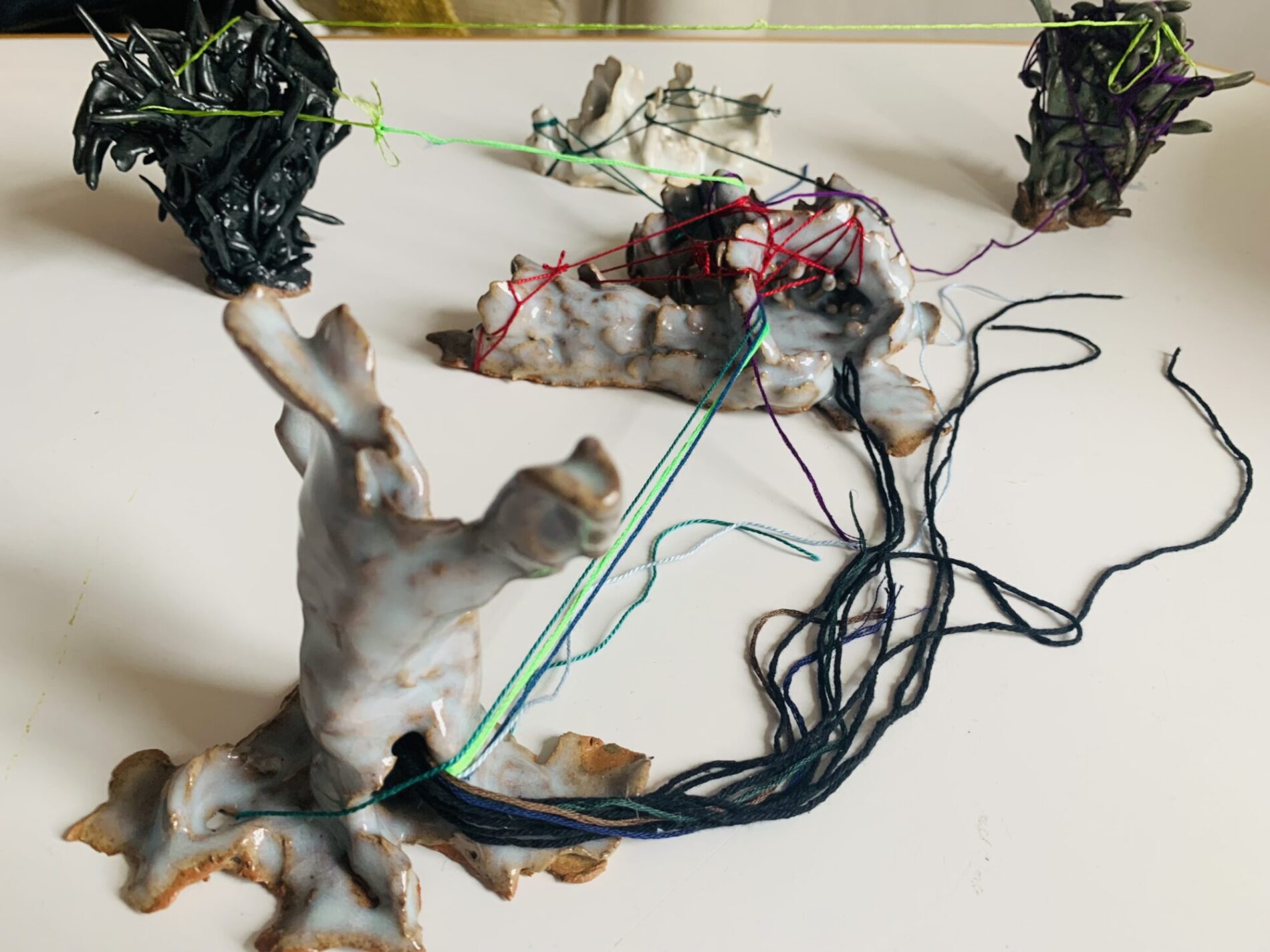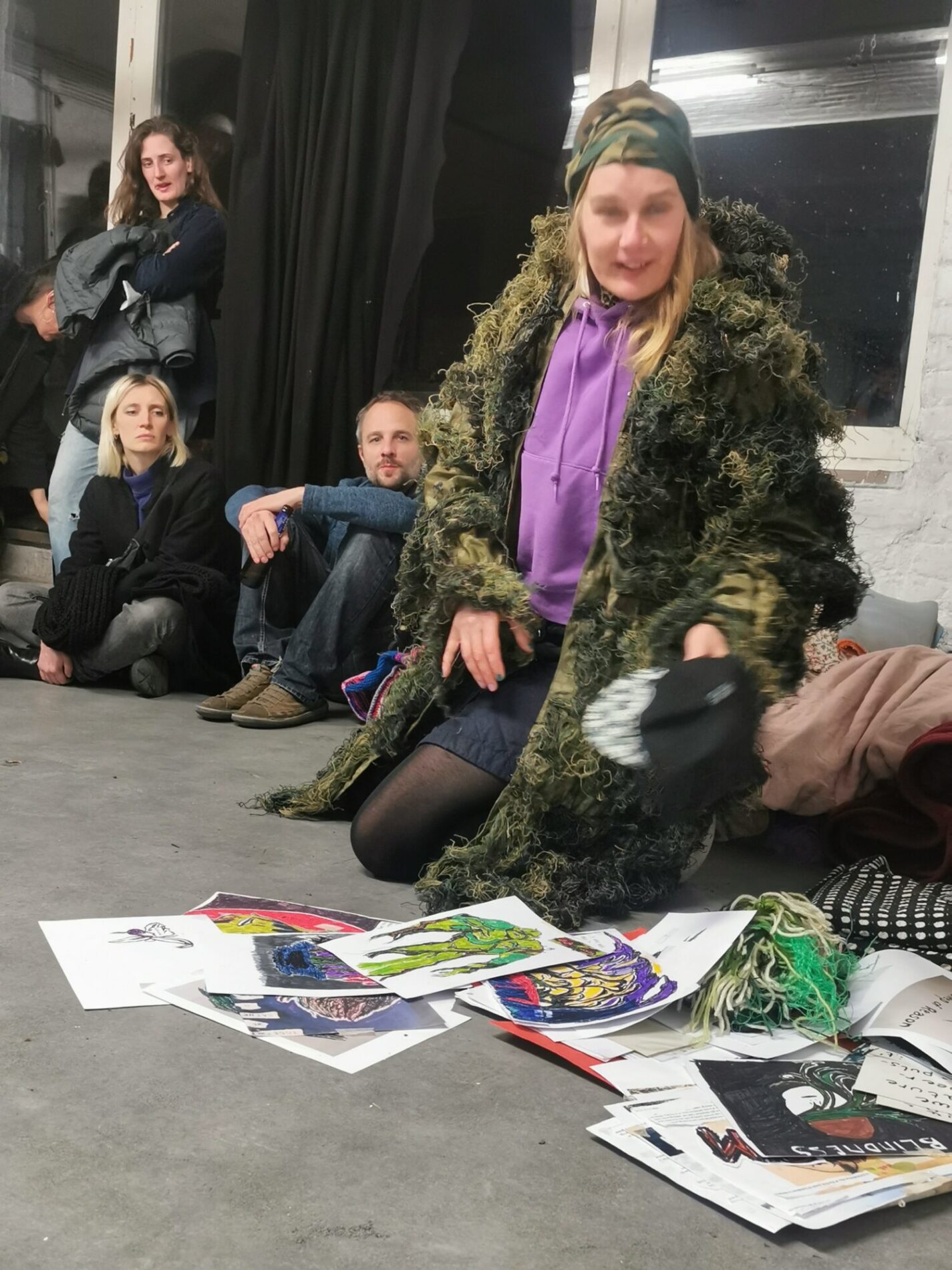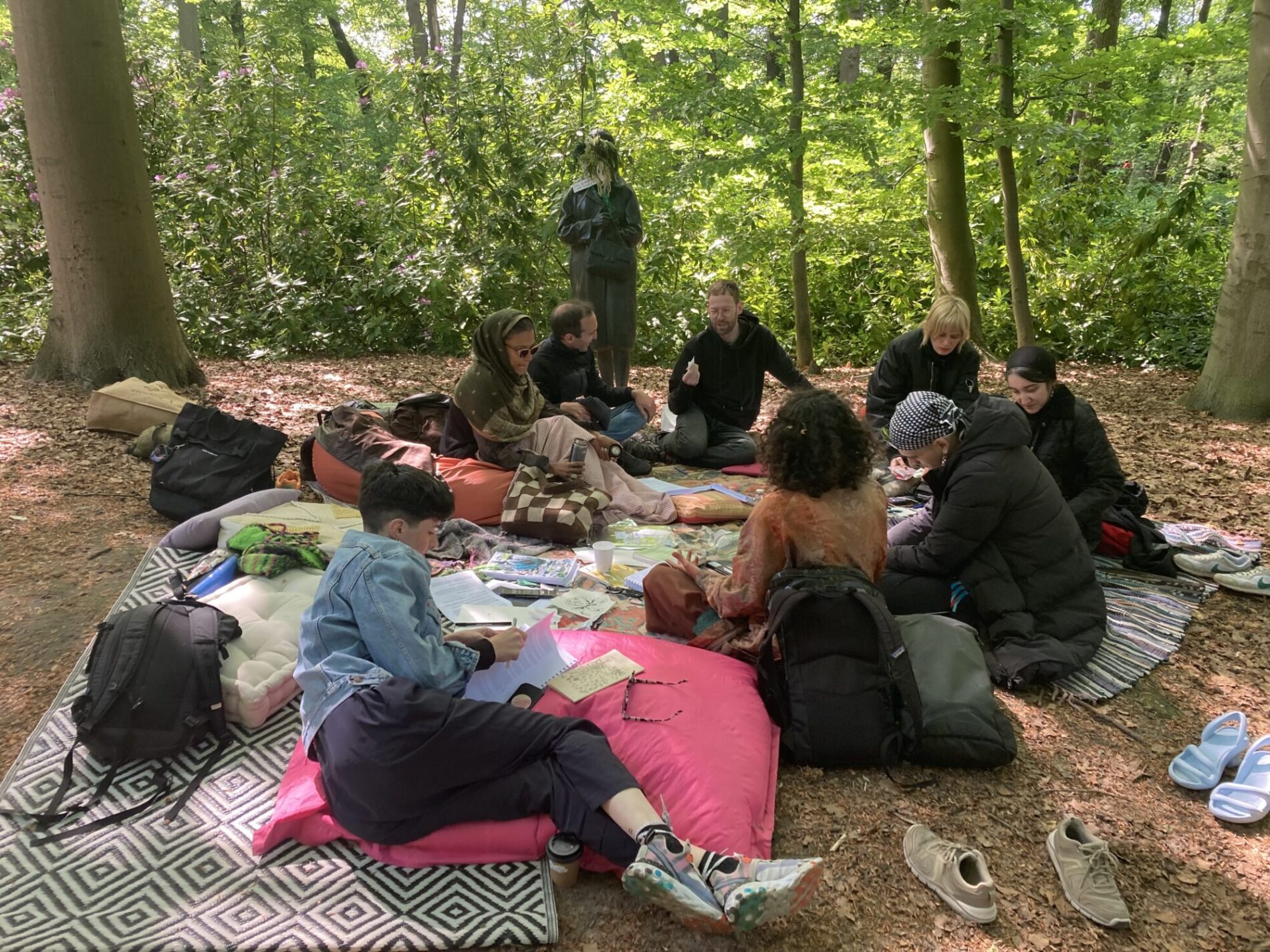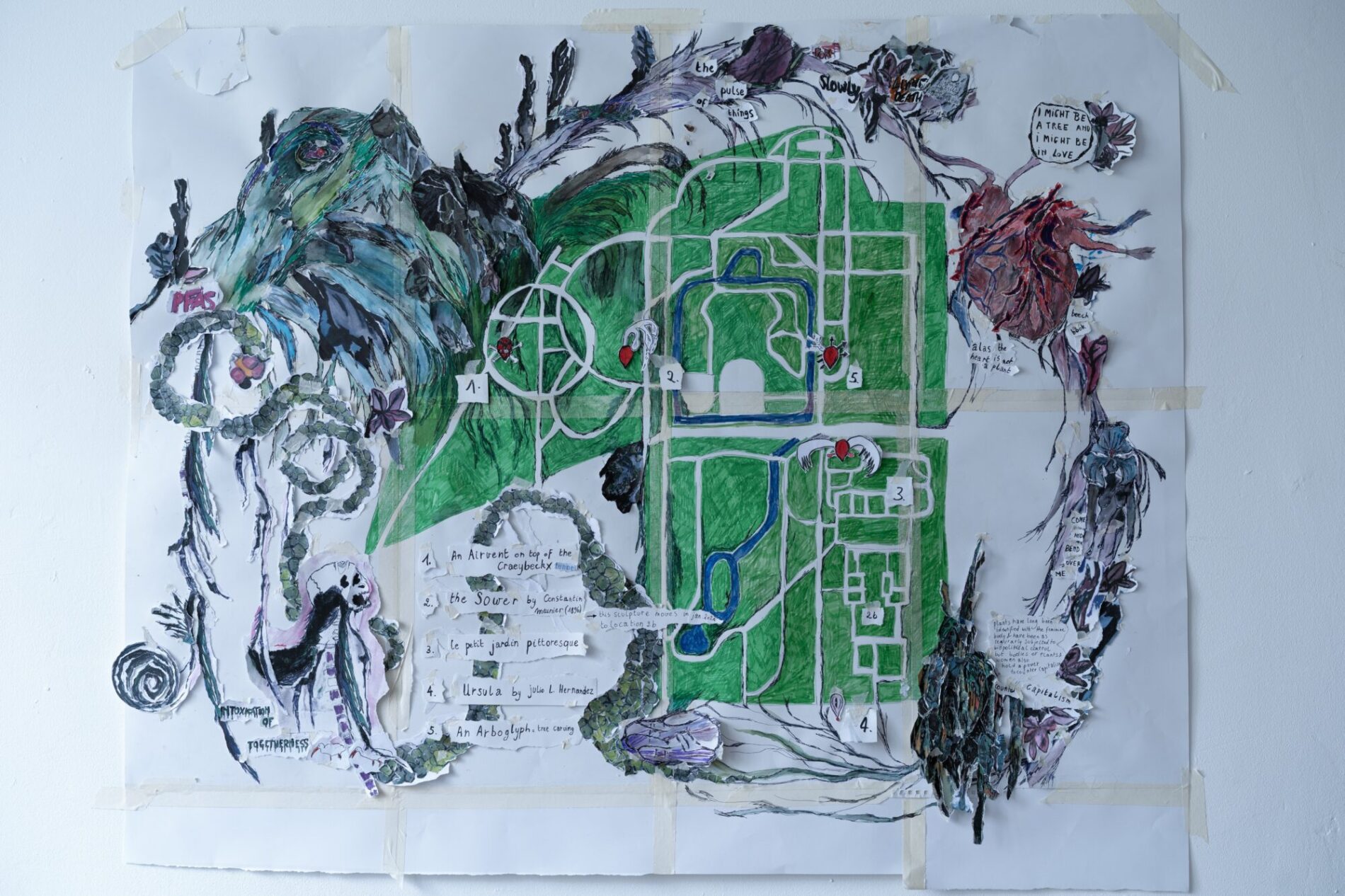 Monsters School (2024, Middelheim, part of Come Closer expo) is a collective and durational experiment, a performative transformation of “school” into a space of co-creation. This process of becoming other is a practice of unlearning and undoing while being many. Therefore we sustain a space of studying and practicing together, sharing knowledge and experiences. The process of undoing that we envision is not a process of healing but in the first place a process of co-creation that is rooted in vulnerability, but equally pleasure. We seek in the pleasure of undoing (rather than doing), a sensuality that is rooted in the body and the senses. The school studies and experiments with what monstrosity could be – a monster has blurry borders, is excessive, hypersensitive – an incoherent assemblage. During Monsters School we are empowered through becoming a living monstrosity. As monsters we show something that is not easy or comfortable to see or perceive. We speculate with different narratives and experiment with tools and formats that explore and enhance the monstrosity in ourselves by becoming more attuned to and challenging the world we inhabit. We see this exploration as necessary for survival and creating livable worlds.